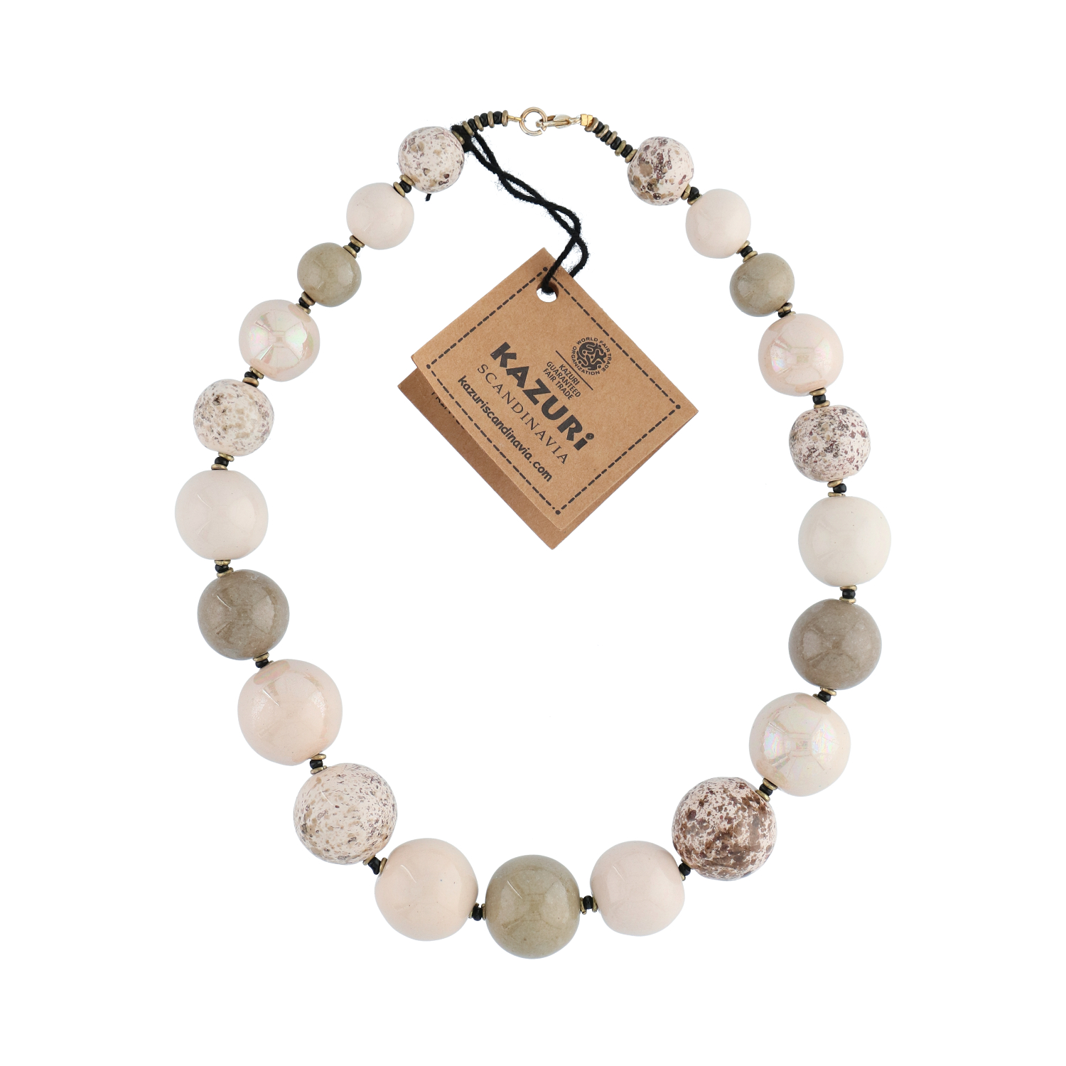 Beskrivelse Perlerne er trådet på fiskesnørre og låsen, samt mellemstykkerne er lavet i forgyldt kopper. Den er nikkelfri efter lovgivningen. Laget av keramink. Håndmalte perler fra Kenya. Bilde lånt fra www.KazuriSacndinavia.dk |