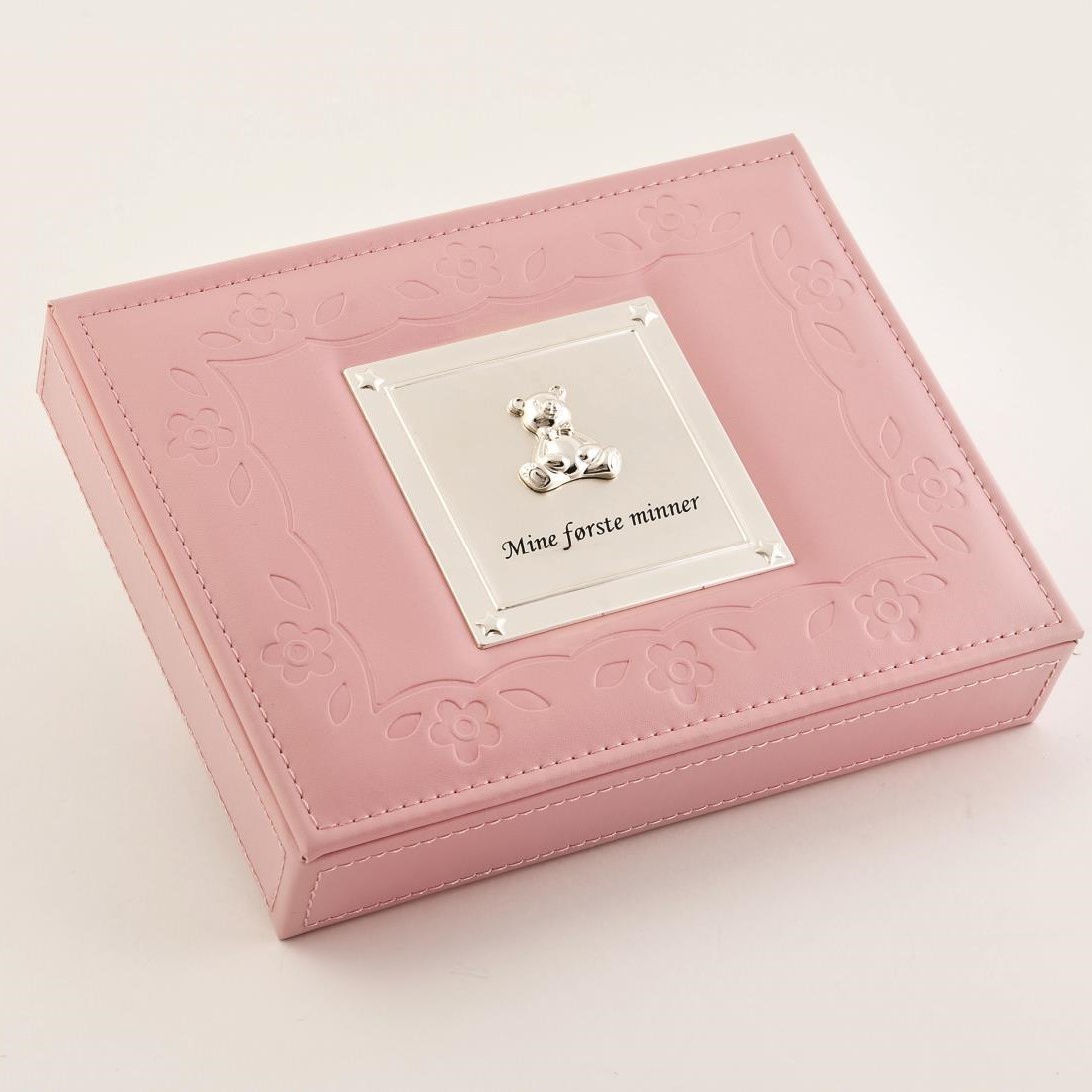 Beskrivelse Minneskrin «Mine første minner» i lys rosa imitert skinn med preget mønster. For smykker, bilder, første hårlokk, første smokk osv. Kan graveres med navn og; om ønskelig; en dato. Størrelse: 18x23cm |