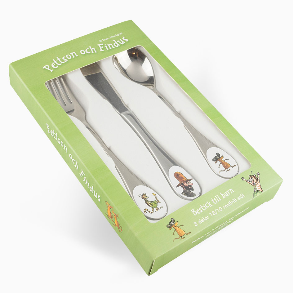 Stål bestikk med bilder av de kjente figurene fra Gubben og katten!