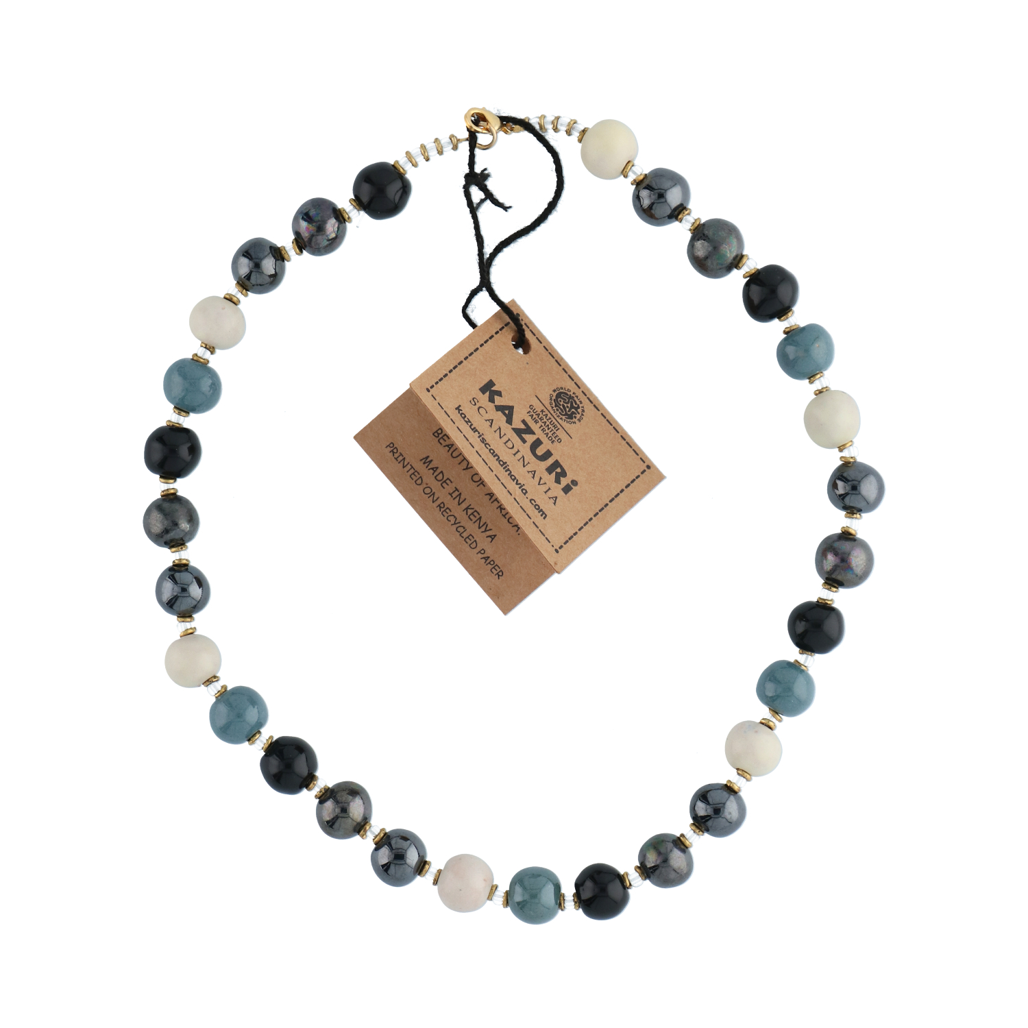Beskrivelse Perlerne er trådet på fiskesnørre og låsen, samt mellemstykkerne er lavet i forgyldt kopper. Den er nikkelfri efter lovgivningen. Laget av keramink. Håndmalte perler fra Kenya. Bilde lånt fra www.KazuriSacndinavia.dk |
