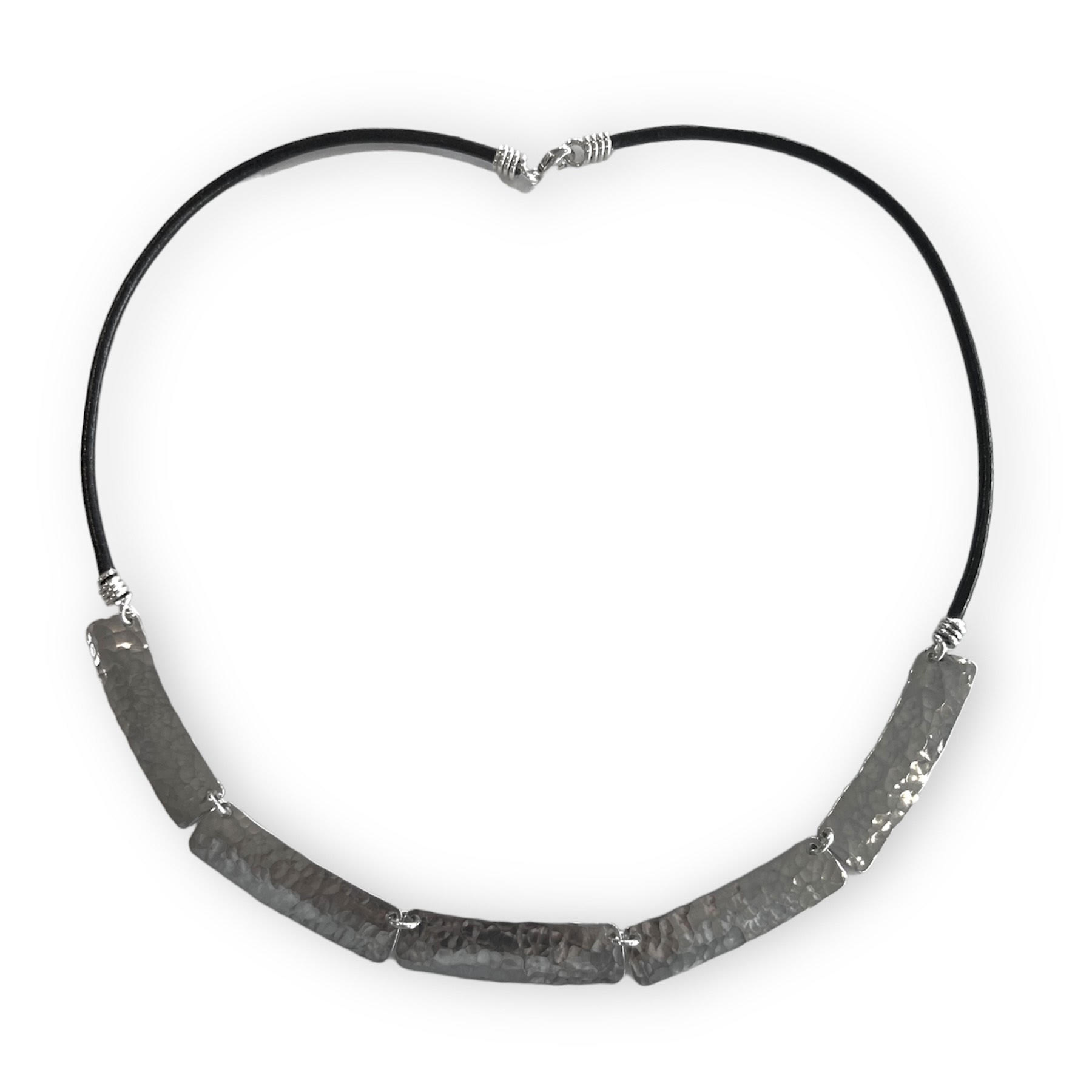 Beskrivelse Egenprodusert hos Klosterfoss Smykkeverksted. Fra kolleksjonen "Retro" Kolleksjonen består av banket sølvsmykker med lær. Håndlaget banket blankt sølv anheng. Lærkjede hører sammen med anhenget! Sølv karabinlås med endefester. Kjede: Lærkjede, 46cm langt - Diameter 2mm Størrelse: 5 plater på 3,6x1cm Tykkelse: 1mm |