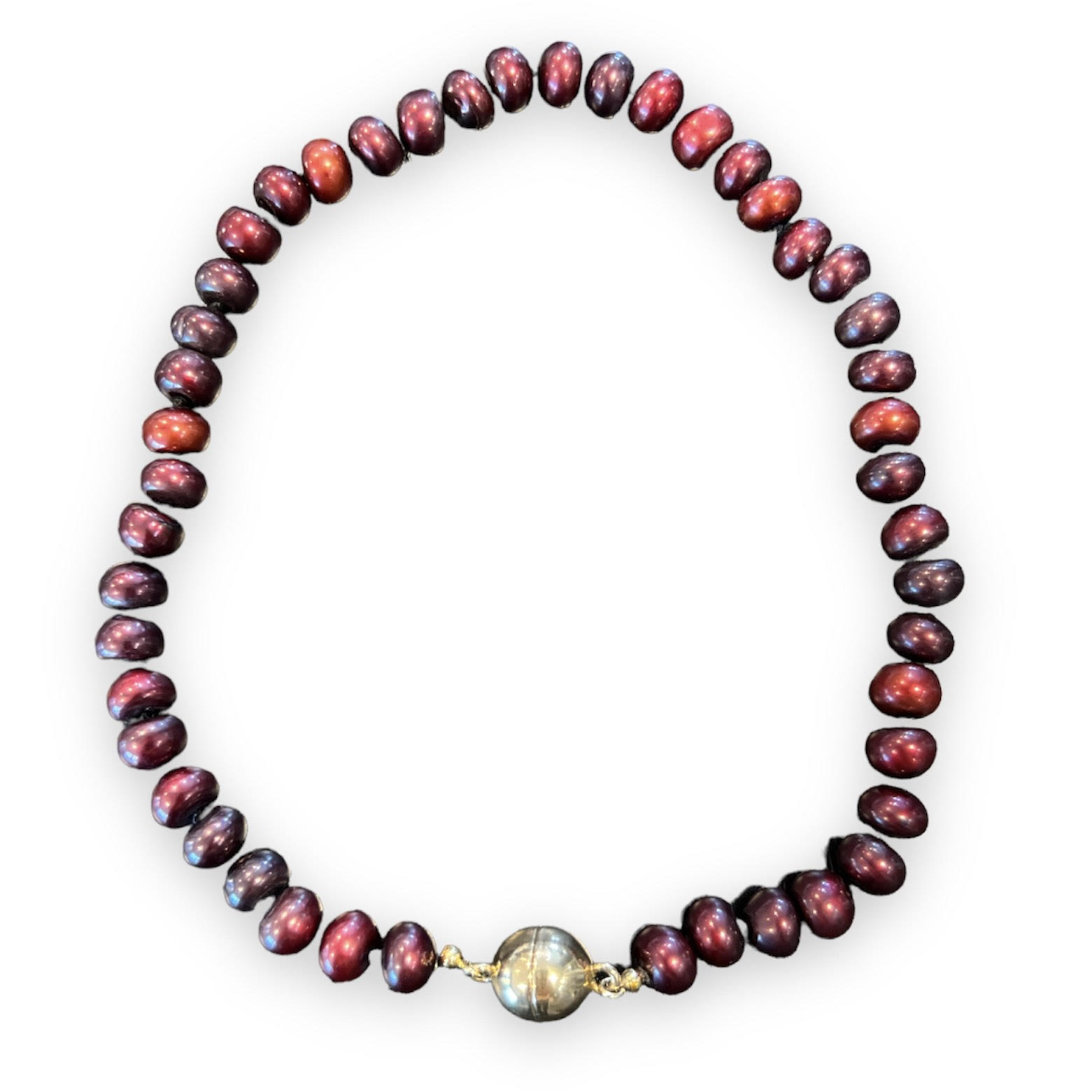 Beskrivelse Håndtred perlekjede hos oss! Ekte ferskvannsperler med med knuter. Perler i en dyp rød farge. Magnetisk lås med endefester, forgylt 925 sølv - 1,2cm Diameter: ca. 1cm Lengde: 40cm |