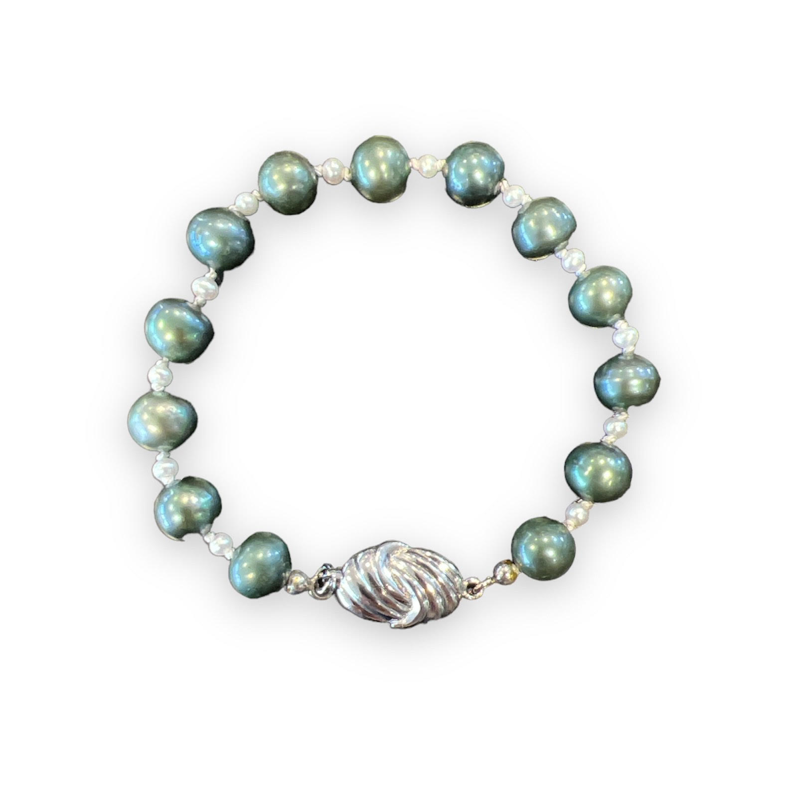Beskrivelse Håndtred perlearmbåndhos oss! Ekte ferskvannsperler med med knuter. Perler i en dyp grønn og hvit farge. Klipslås, 925 sølv - 1x1,7cm Diameter: ca. 0,7cm og ca. 0,2cm Lengde: 18cm |