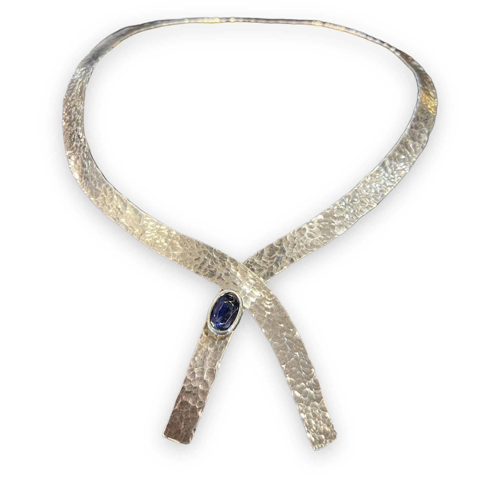 Beskrivelse Egenprodusert hos Klosterfoss Smykkeverksted. Fra kolleksjonen "Retro" Kolleksjonen består av banket sølvsmykker med lær. Håndlaget banket blankt sølv med en stor krysanitt stein. Tykkelse: 1mm |
