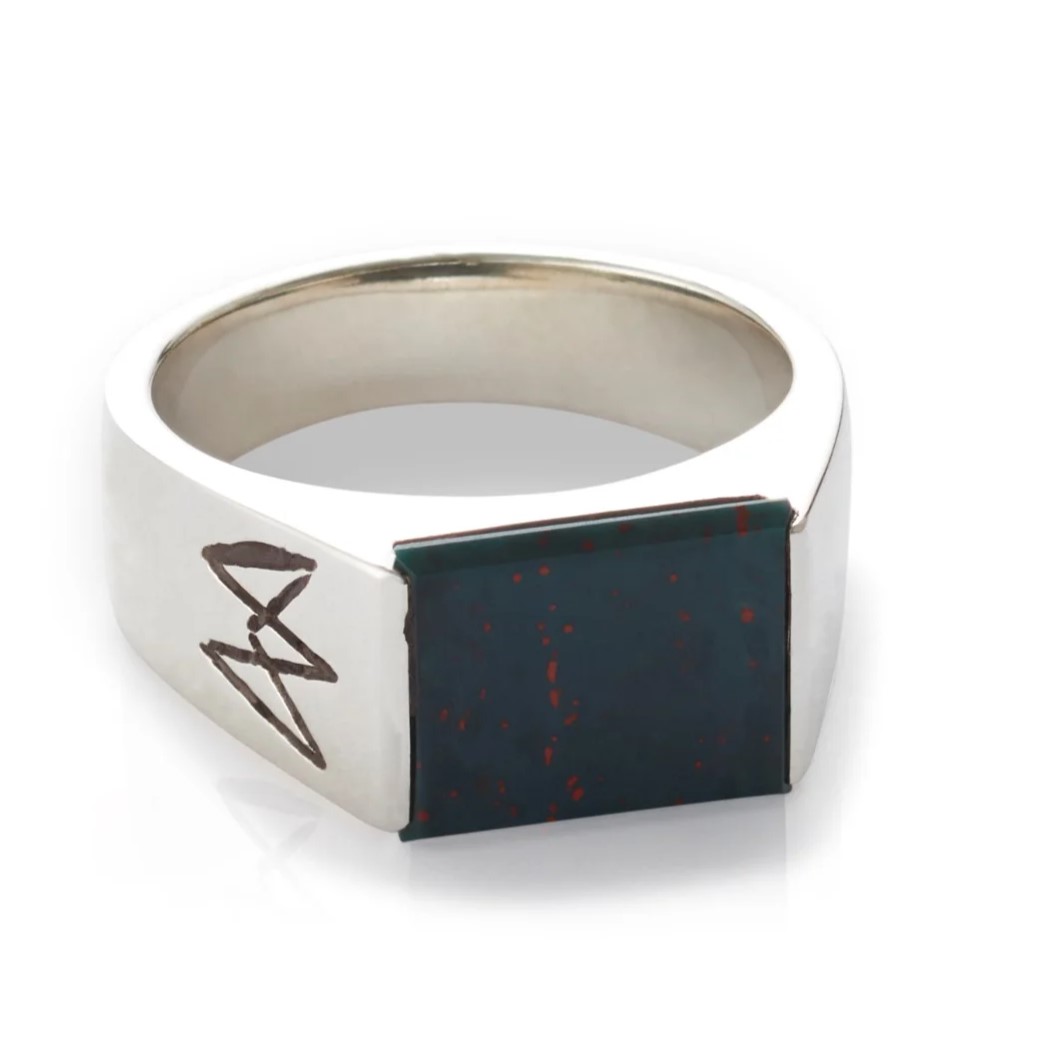 Beskrivelse Unisex ring med heliotrop fra Arven. Ringen har glatte kanter og sider, noe som gir et stilrent uttrykk. Heliotrop er en grønn jaspis med røde pletter og det sies blant annet at heliotropen genererer energi, varme og fysisk styrke til den som bærer den. Materiale: 925 Sterling sølv Bredde: 6 mm Tykkelse målt fra innside til utside av ring: 1,5 mm |