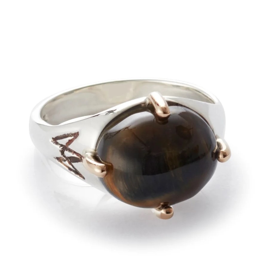 Beskrivelse Unisex ring med gullklør og falkeøye fra Arven. Ringen har en nydelig buet form og falkeøye blir holdt på plass av klør i gult gull. Falkøye skal gi indre fred og kraft og skal beskytte mot negative påvirkninger fra omgivelsene til den som bærer den. Materiale: 925 Sterling sølv, klør 585 gult gull Bredde: 3 mm Tykkelse målt fra innside til utside av ring: 1,5 mm |