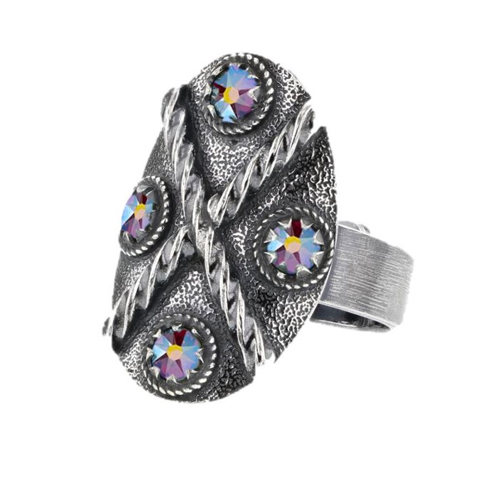 Beskrivelse Regulerbar ring i oksidert sølv med 4 Swarovskikrystallar i farge 30. B 1,8 cm H 2,7 cm. Ta kontakt dersom du ønskjer å sette saman din eigne fargekombinasjon. |
