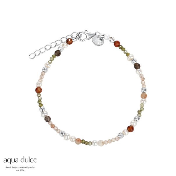 Beskrivelse Armbånd i sterling sølv med rosa, oliven, rust halvedelsten, perler & twistet sølvkuler. - 100% nikkelfri - 925 Sterling sølv - Lengde: 17cm + 3cm |