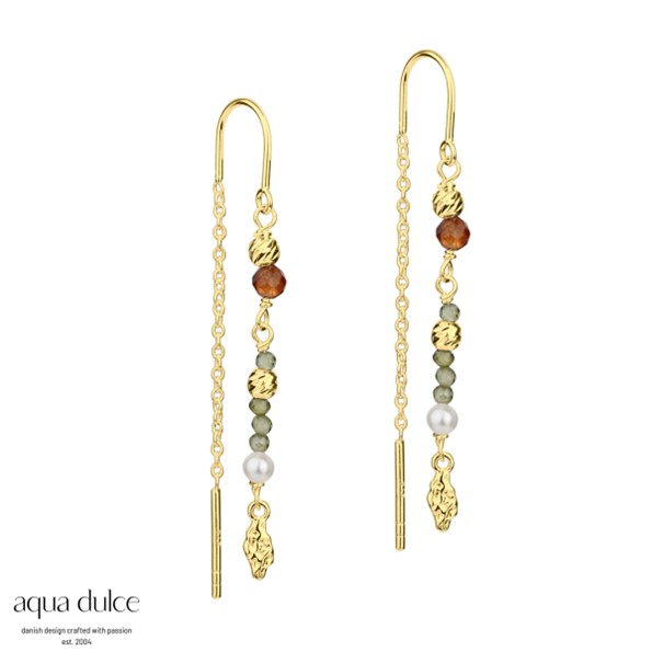 Beskrivelse Øretråd i forgylt sterling sølv med oliven farga, røgfarget halvedelsten, perle og lille ruflet vedheng. - 100% nikkelfri - 925 Sterling sølv, forgylt |