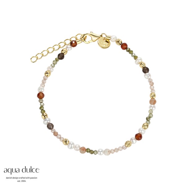 Beskrivelse Armbånd i forgylt sterling sølv med rosa, oliven, rust halvedelsten, perler & twistet sølvkuler. - 100% nikkelfri - 925 Sterling sølv, forgylt - Lengde: 17cm + 3cm |