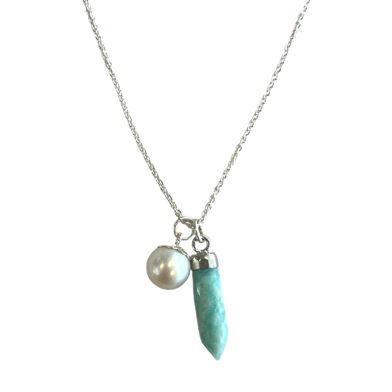 Beskrivelse Steiner: Amazonitt & ferskvannsperle Metall: 925 Sølv Lengde: 42 & 45cm Elegant krystall anheng med fasetslipt amazonitt og ferskvannsperle. Anhenget er fremstillet med teknikken elektroforming og platinert. Laget av 925/- sølv som er platinert. Noen mennesker tillegger stein og krystaller en betydning, andre velger de etter deres utseende. Amezonitt skulle gi harmoni og ro. |