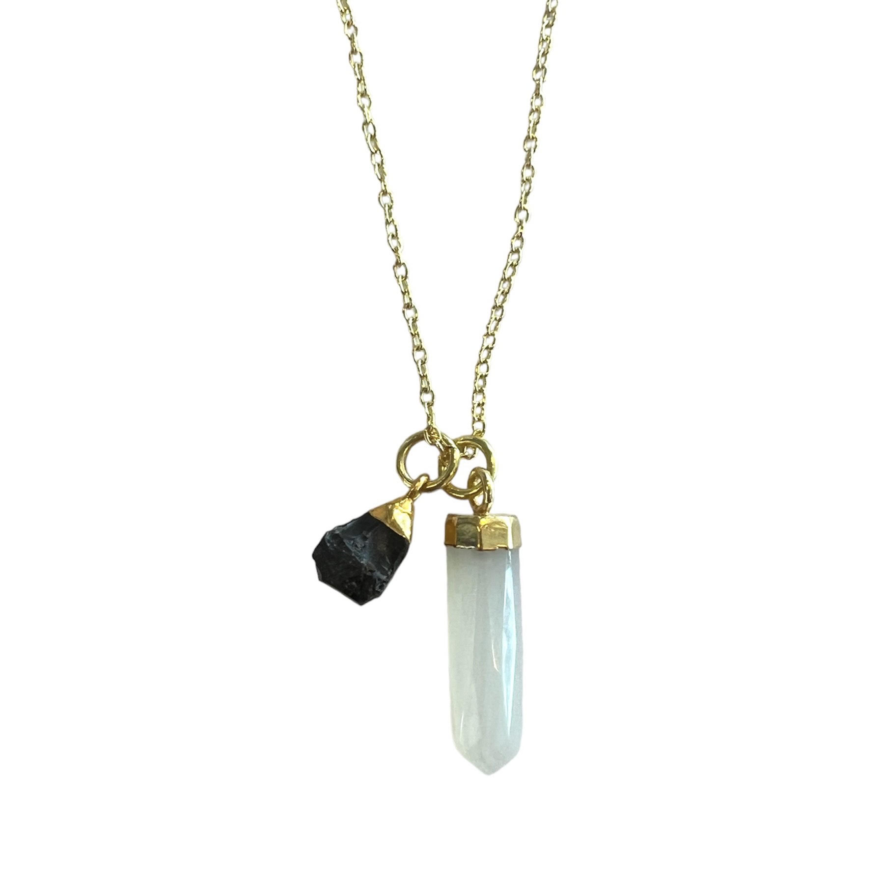 Beskrivelse Steiner: Kalcedon & onyx Metall: 925 Sølv, forgylt Lengde: 50cm Elegant krystall anheng med fasetslipt hvit kalcedon og onyx. Anhenget er fremstillet med teknikken elektroforming og platinert. Laget av 925/- sølv som er forgylt. Noen mennesker tillegger stein og krystaller en betydning, andre velger de etter deres utseende. Hvit kalcedon skulle gi mod og handlekraft til å overvinde usikkerhed. |