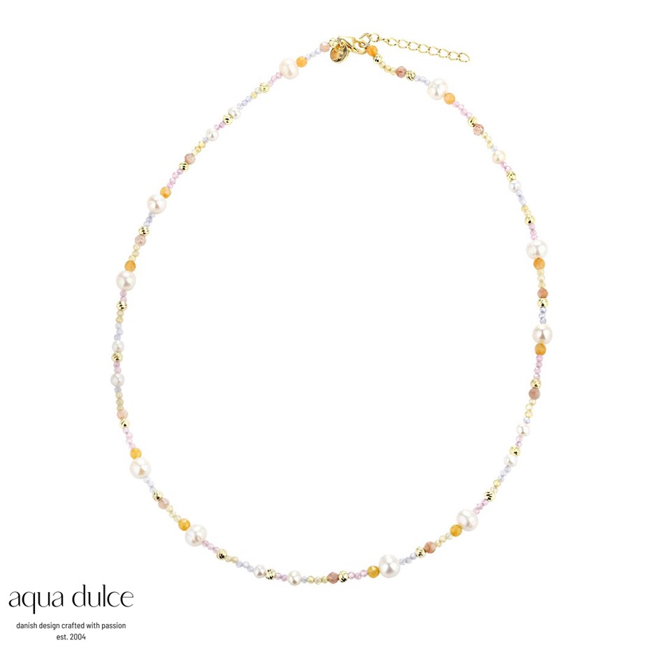 Beskrivelse Halskjede i forgylt sterling sølv med pastel farger, ferskvannsperler & twistet sølvkuler. - 100% nikkelfri - 925 Sterling sølv, forgylt - Lengde: 42cm + 3cm |
