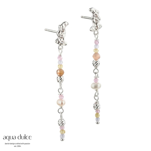 Beskrivelse Øredobber i sterlingsølv med anheng med volanger, zirkonia, halvedelstener og hvite ferskvannsperler. - 100 % nikkelfri - 925 Sterling sølv - Lengde: 5,5cm |