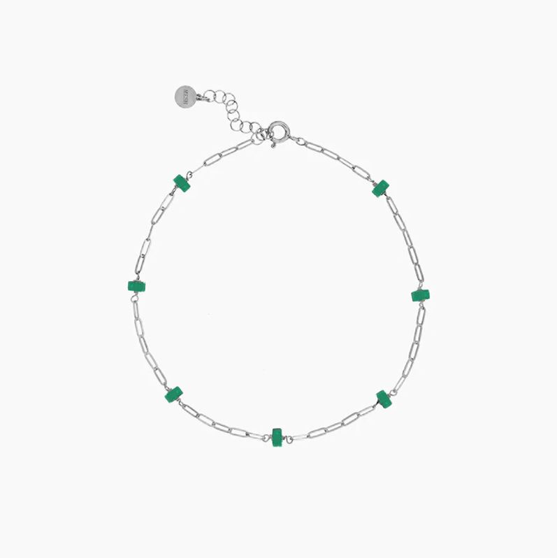 Beskrivelse Fotlenke i rhodinert sølv og naturstein. Sammensetning: Sterling sølv Overflate: Rhodinert Ankellengde: 26 cm + 3 cm forlengelse Kjede tykkelse: 2mm Steiner: Agater Vekt: 1,6 g Håndlaget lokalt i Porto i Portugal med 100 % resirkulert sølv. |