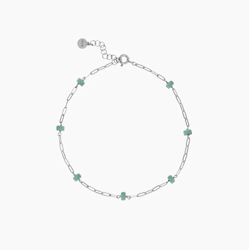 Beskrivelse Fotlenke i rhodinert sølv og naturstein. Sammensetning: Sterling sølv Overflate: Rhodinert Ankellengde: 26 cm + 3 cm forlengelse Kjede tykkelse: 2mm Steiner: Turkis Vekt: 1,6 g Håndlaget lokalt i Porto i Portugal med 100 % resirkulert sølv. |
