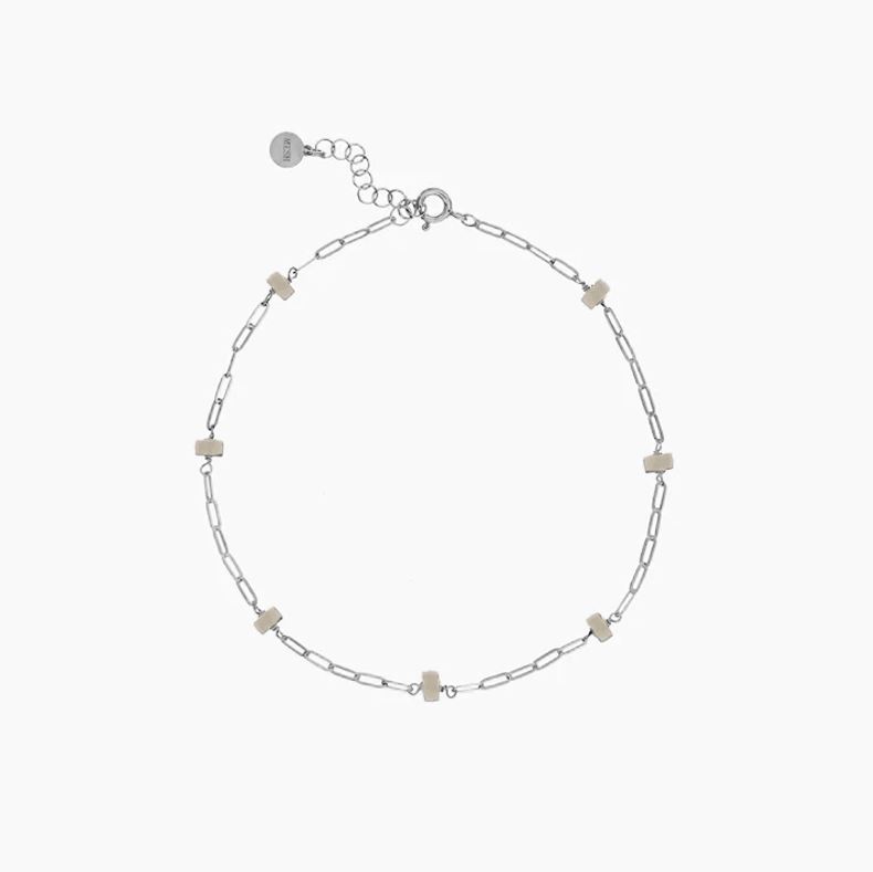 Beskrivelse Fotlenke i rhodinert sølv og naturstein. Sammensetning: Sterling sølv Overflate: Rhodinert Ankellengde: 26 cm + 3 cm forlengelse Kjede tykkelse: 2mm Steiner: Howlitter Vekt: 1,6 g Håndlaget lokalt i Porto i Portugal med 100 % resirkulert sølv. |
