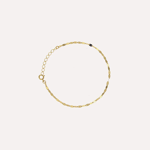 Beskrivelse Lenke armbånd i forgylt sølv. Material: Sterling Sølv, 925 Overflate: Forgylt Kjedelengde: 16 +3cm Tykkelse: 2mm Vekt: 2,0 g Håndlaget lokalt i Porto i Portugal med 100 % resirkulert sølv. |