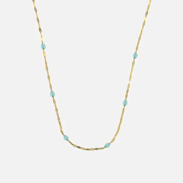 Beskrivelse Halskjede i forgylt sølv og fargede hydrotermiske steiner. Material: Sterling Sølv, 925 Overflate: Forgylt Kjedelengde: 40 +3cm Stein dimensjon: 4 x 4 mm Vekt: 2,0 g Håndlaget lokalt i Porto i Portugal med 100 % resirkulert sølv. |