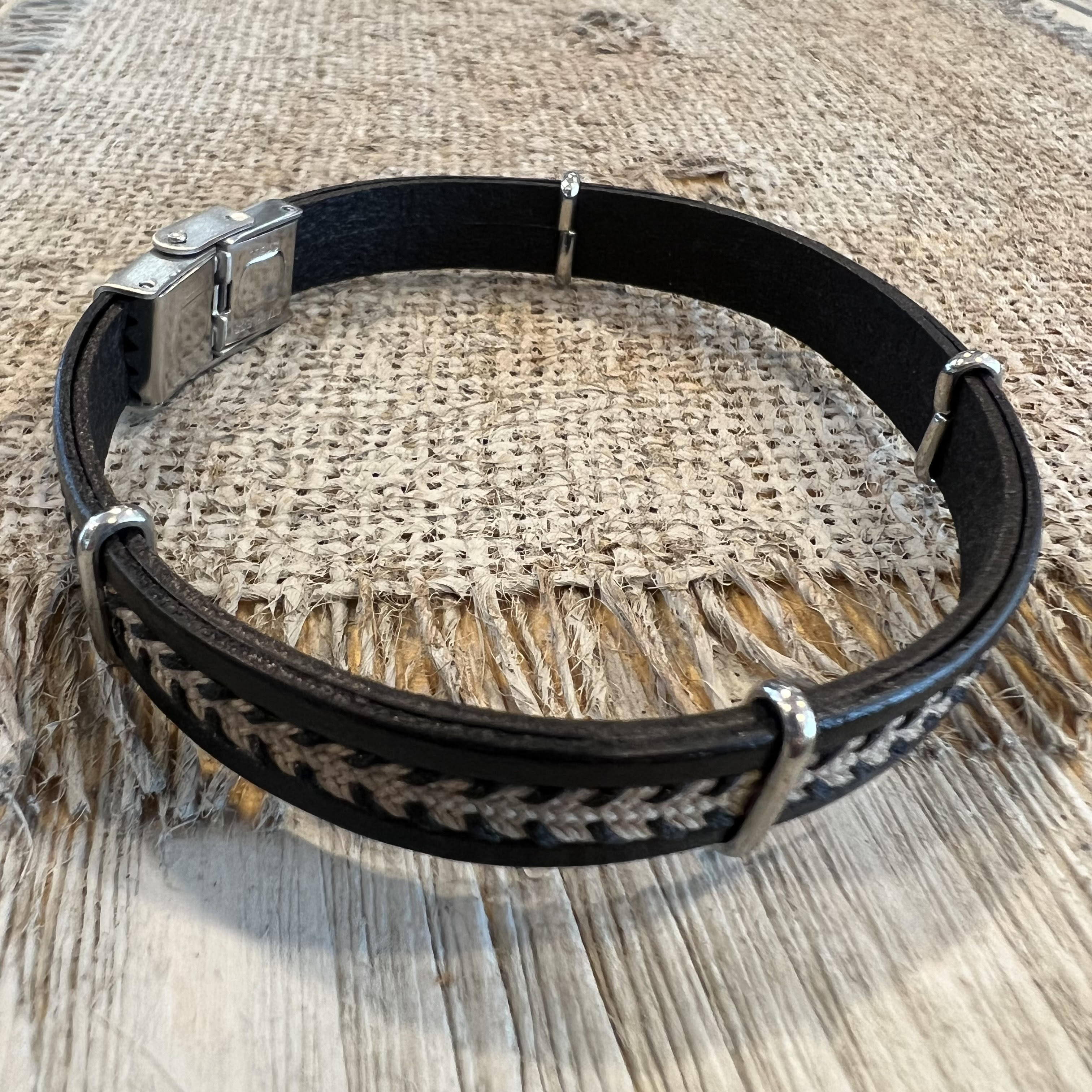 Armbånd i lær med tråd flettemønster. Enkel klipslås.