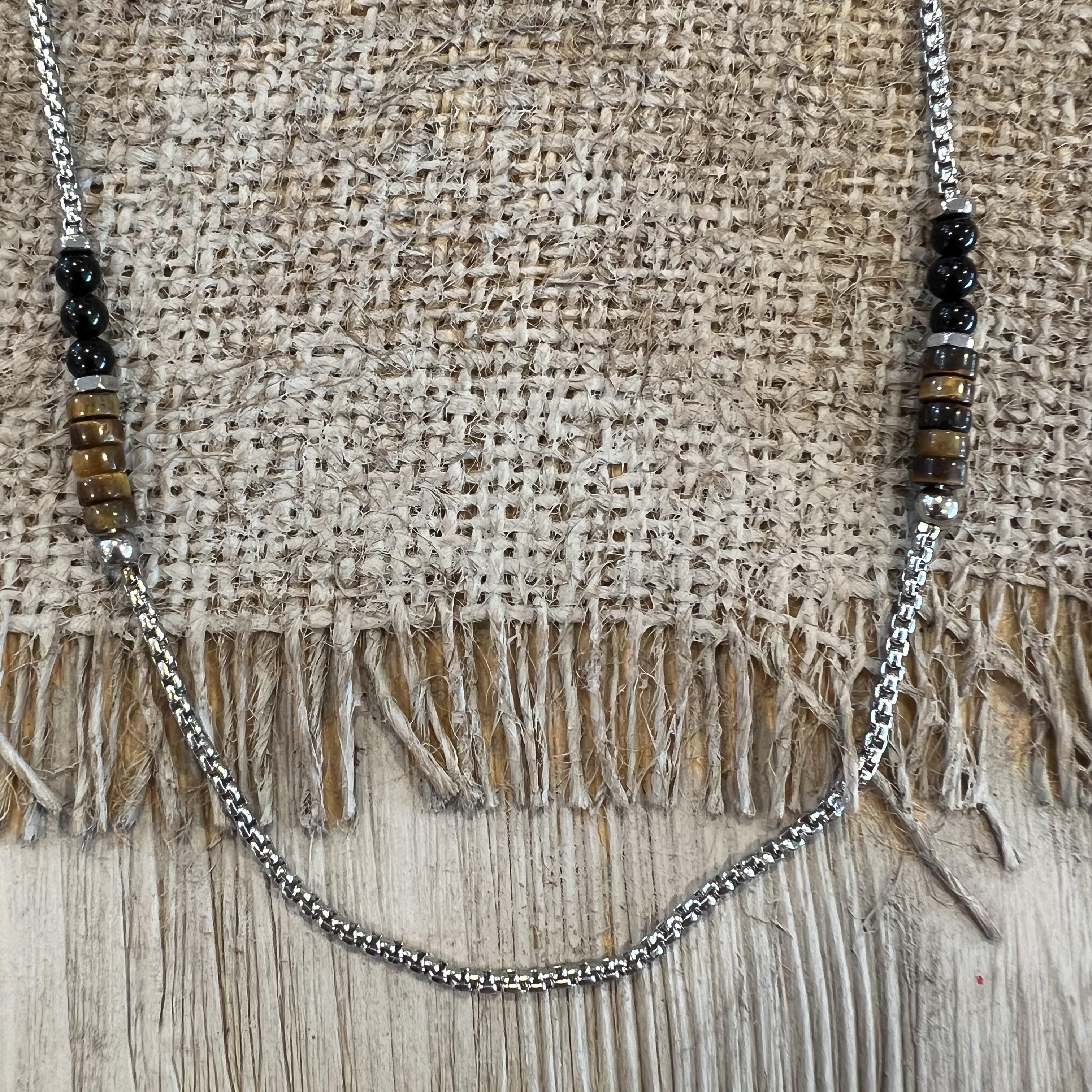 Beskrivelse Moderne kjede med natursteiner. Kan brukes på to ulike lengder. Lengde: 56cm & 62cm Bredde på steiner: 4 - 4,5mm Bredde på lenke: 2mm Materiale: natursteiner, stål |