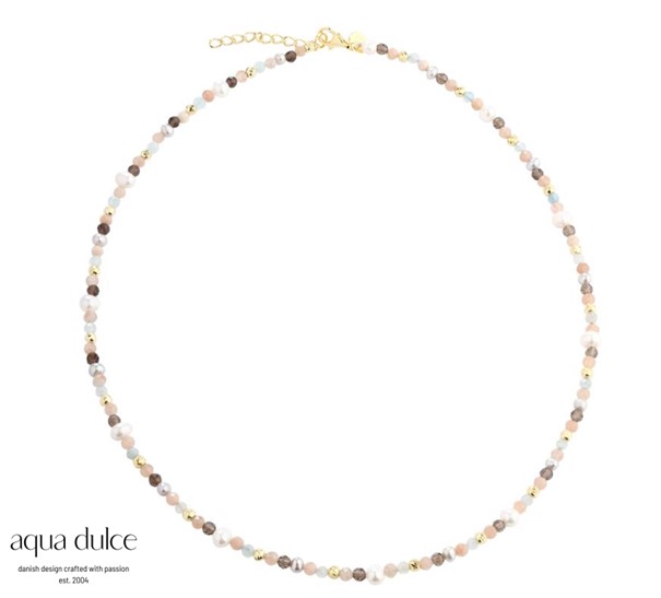 Beskrivelse 42 cm. Kjede med halvedelstener, gullbelagte sølvkuler og ferskvannsperler. - 100 % nikkelfri - 925 gullbelagt sterling sølv - Størrelse: 42 cm + 3cm |