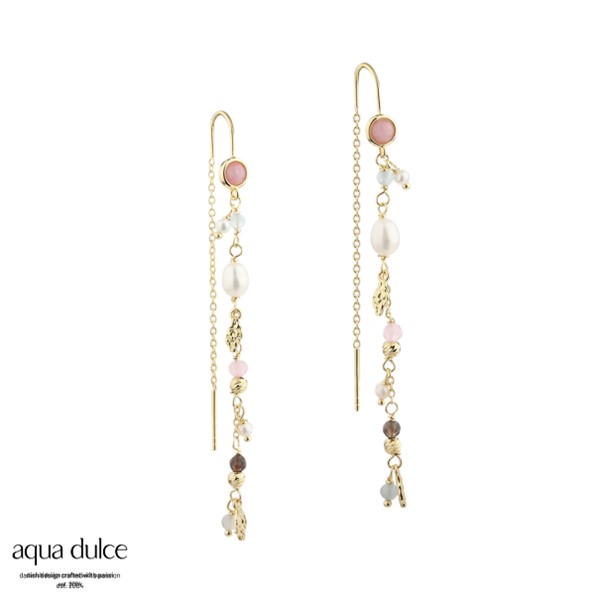 Beskrivelse Øredobber i forgylt sterlingsølv med rosa kalsedon, ferskvannsperler og halvedelstener. - 100% nikkelfri - 925 forgylt Sterling sølv - Lengde: ca. 6cm |
