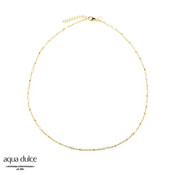 Beskrivelse Halskjede i forgylt sterlingsølv med små prikker og risformede ferskvannsperler. - 100% nikkelfri - 925 Forgylt Sterling sølv - Lengde: 42cm +3cm |