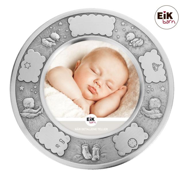 Rund fotoramme i ekte tinn. Felter til gravering av alle fødsels- og dåpsdata.