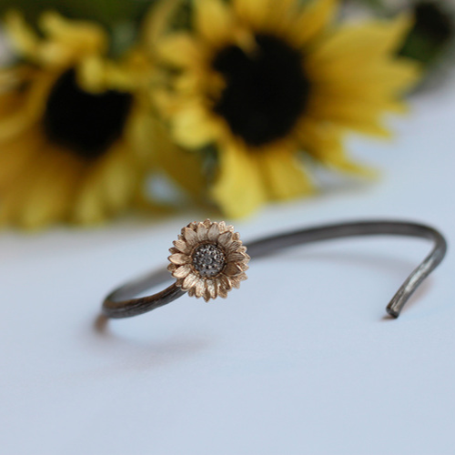 Beskrivelse Delikat armbånd laget i bronse med en strålende solsikke på enden av stilken. I den andre enden av stilken sitter en gnistrende hvit safir. Denne kombinasjonen sammen med nøye utført håndverk gjør dette armbåndet til et enestående smykke, som du kan velge å bruke hver dag eller på en ekstra spesiell dag. Armbåndet settes på over håndleddet ved å skille grenene horisontalt. Ikke tre den over hånden. Detaljer og materialer Metall: Bronse og detaljer i 14K gull Stein: Safir Mål: Solsikken er 10 x 10 mm. Armbåndet er 4 mm bredt Dette armbåndet er Onesize og justerbart. Våre smykker er alltid allergitestet og nikkelfrie Bilde lånt fra leverandør nettside: www.lottajewellery.com |