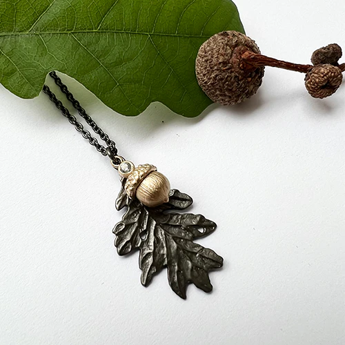 Beskrivelse Tiny Mighty Oak Necklace fra Lotta Jewellery er et kjede laget av bronse og med detaljer i 14K gull og glitrende hvite safirer. Halskjedet er pent og vakkert, laget med høy presisjon for å få alle de minste detaljene i både blader og eikenøtter. Herlig! Detaljer og materialer Metall: Bronse og detaljer i 14K gull Stein: Safir, 1 stk Dimensjoner: 29 x 18 mm (blad), 10 x 5 mm (eikenøtt) Kjedet er 45 cm Våre smykker er alltid allergitestet og nikkelfrie. Bilde lånt fra leverandør nettside: www.lottajewellery.com |
