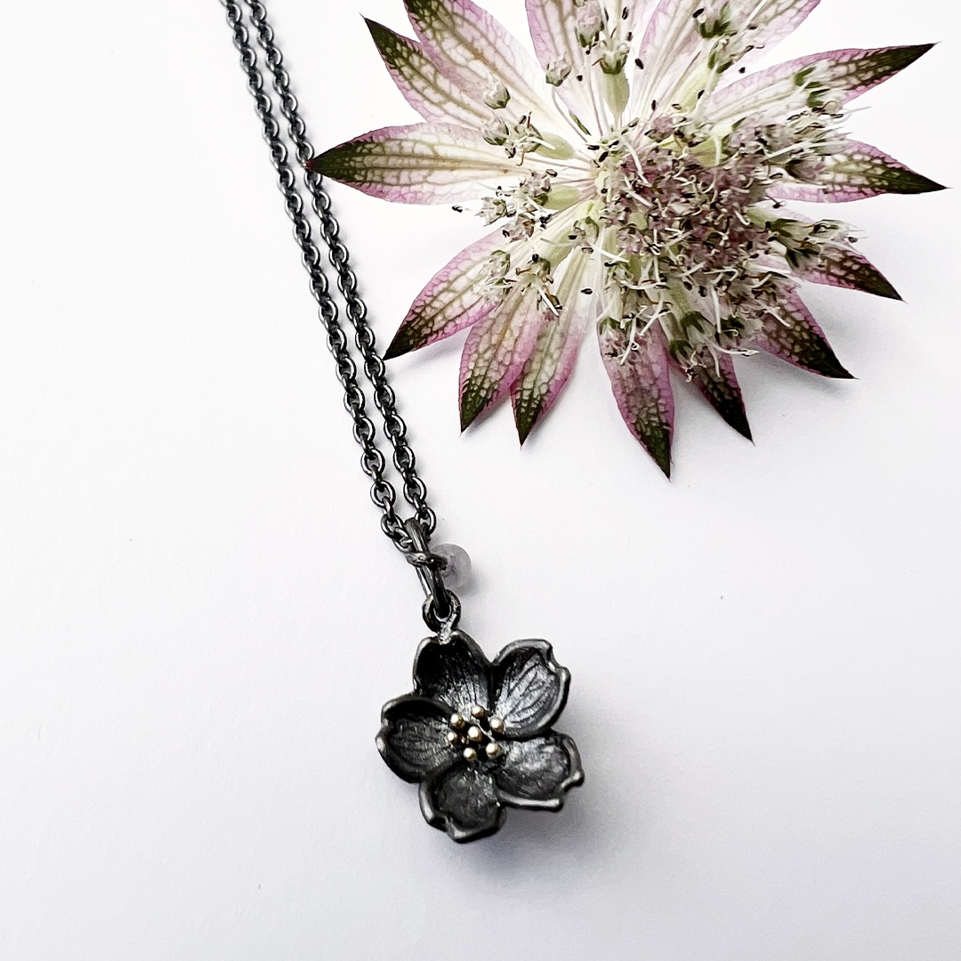Beskrivelse En vakker kirsebærblomst hengende på en tynn kjede. Stilig design med myke 14k gulldetaljer og lettere rosenkvarts. Et enkelt halskjede å ha på seg selv eller kombinere med andre. Detaljer og materialer Metall: Bronse og detaljer i 14K gull Stein: Matt Rose Quartz, 1 stk på 3 mm Mål: 15,4 mm høy x 12,8 mm bred Kjedet er justerbart til 45-48-51 cm Våre smykker er alltid allergitestet og nikkelfrie. Bilde lånt fra leverandør nettside: www.lottajewellery.com |
