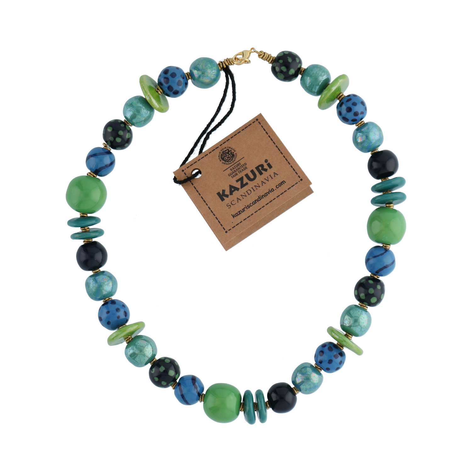 Beskrivelse Perlerne er trådet på fiskesnørre og låsen, samt mellemstykkerne er lavet i forgyldt kopper. Den er nikkelfri efter lovgivningen. Laget av keramink. Håndmalte perler fra Kenya. Bilde lånt fra www.KazuriSacndinavia.dk |