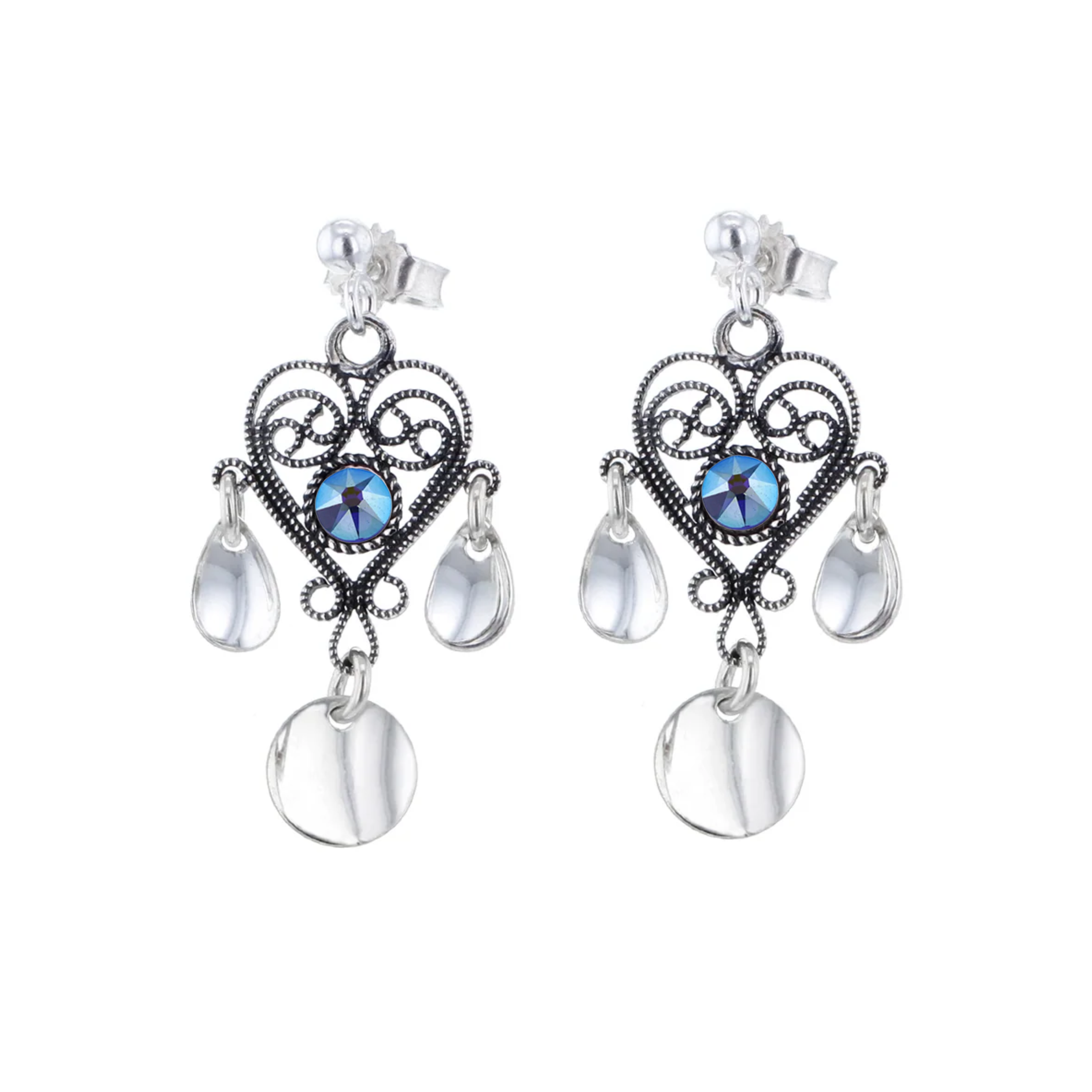 Ørepynt i oksidert sølv med stein og blanke lauv.