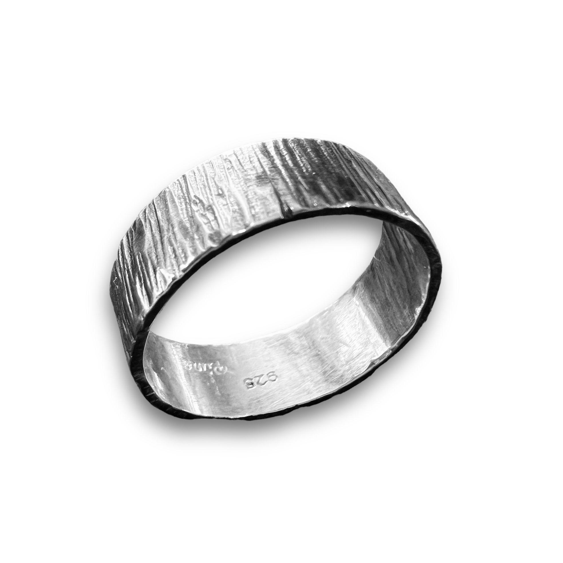 Beskrivelse Banket sølvring som ser ut som bark med oksyd for å få frem detaljer. Her ring er unik, derfor varierer de i design og bredde. Materiale: Sølv 925, oksidert Bredde: Ca. 7-8mm |