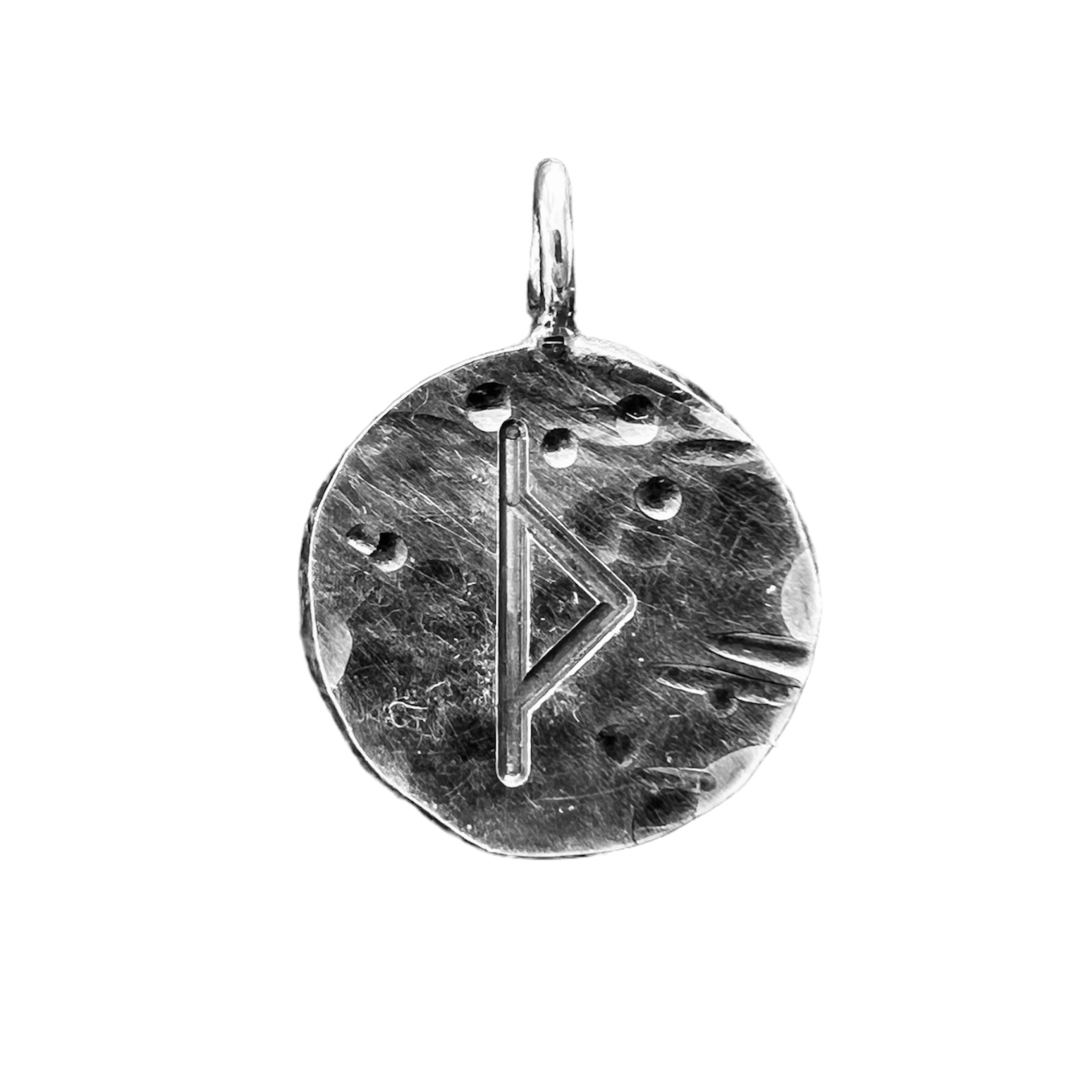 Beskrivelse Håndlaget hos oss! Alle er unike! Laget og designet av vår utrolig flinke Kristin Dalen! Laget i 925 sølv, hamret og oksidert. Dette er små plate anheng. Hvert anheng er forskjellig, dette har en diameter på 1,3cm THURISAZ - Vi har alle en mørk side, og denne runen anerkjenner det. Den forteller deg at du må akseptere din mørke side som en del av hele ditt, og at din menneskelige kamp er å kontrollere den delen av deg og overvinne den. Varsler deg om motgang og gir deg styrke. |