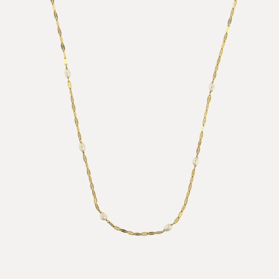 Beskrivelse Halskjede i forgylt sølv og ferskvannsperler steiner. Material: Sterling Sølv, 925 Overflate: Forgylt Kjedelengde: 40 +3cm Stein dimensjon: 4 x 4 mm Vekt: 2,0 g Håndlaget lokalt i Porto i Portugal med 100 % resirkulert sølv. |