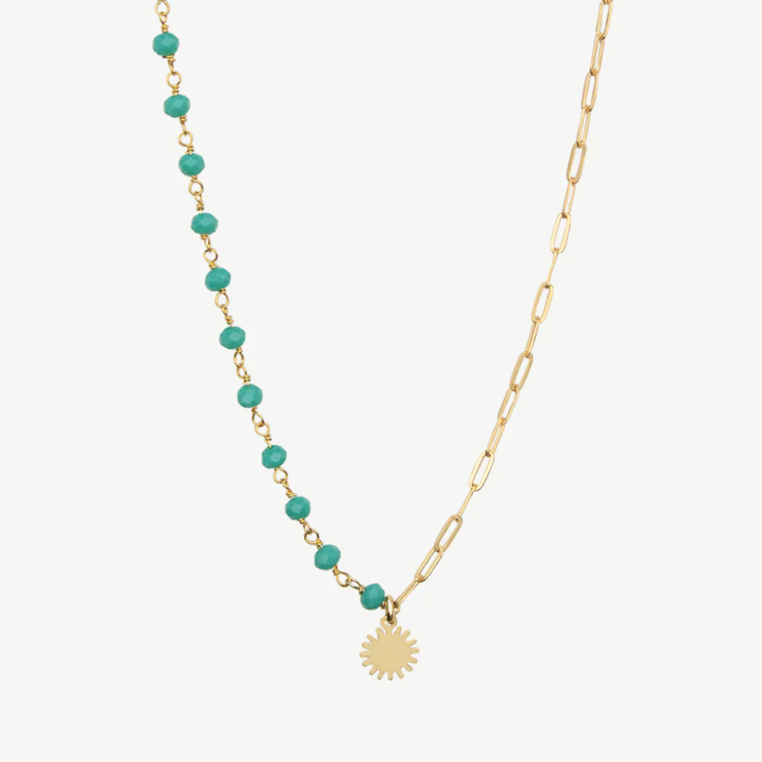Beskrivelse Halskjede i forgylt sølv og fargde steiner. Material: Sterling Sølv, 925 Stein: Hydrothermal Overflate: Forgylt Kjedelengde: 40 + 3cm Stein dimensjon: 0.3 cm Anheng: 0.7 cm Vekt: 3g Håndlaget lokalt i Porto i Portugal med 100 % resirkulert sølv. |