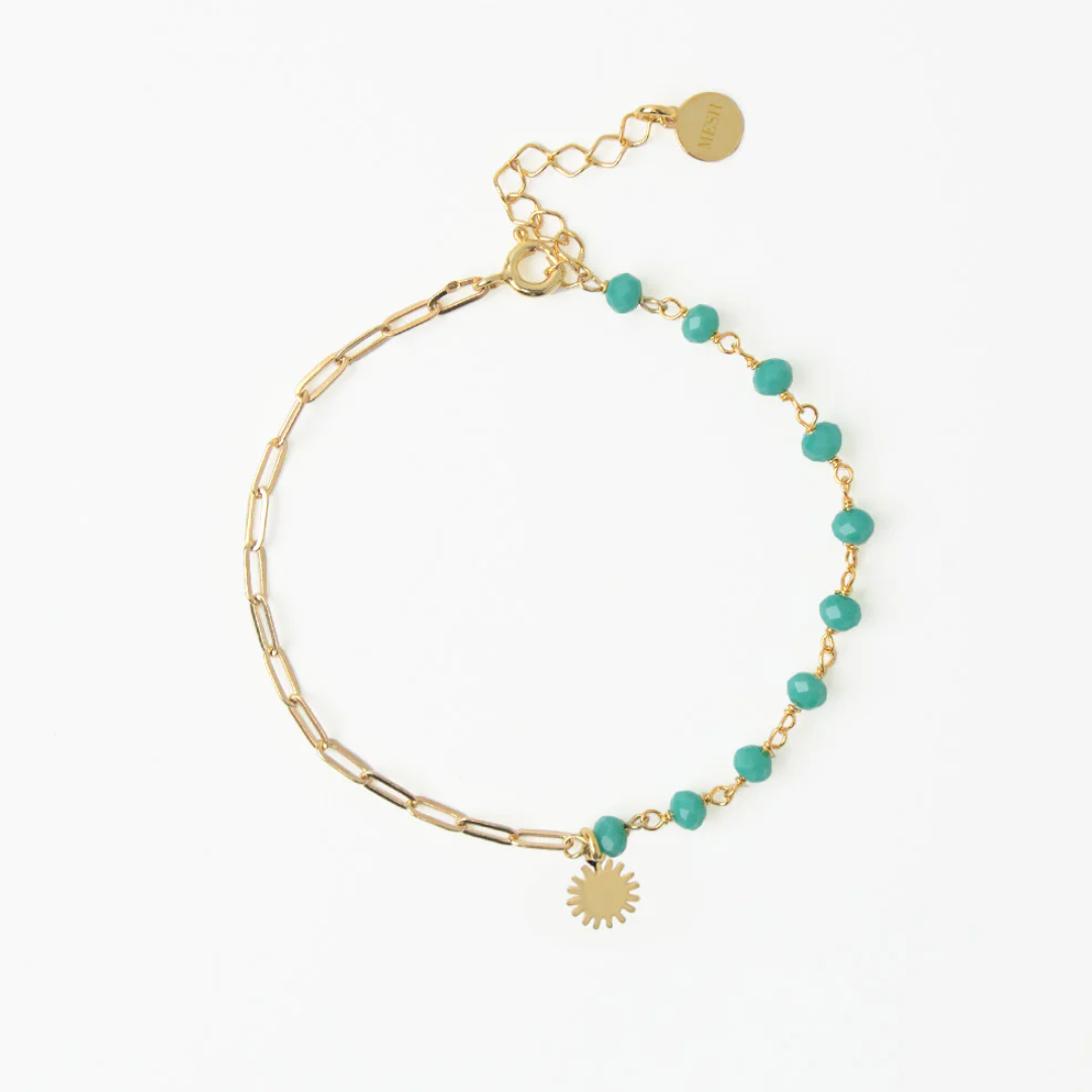 Beskrivelse Armbånd i forgylt sølv og fargede steiner. Material: Sterling Sølv, 925 Overflate: Forgylt Kjedelengde: 16 + 3cm Vekt: 1,9 g Håndlaget lokalt i Porto i Portugal med 100 % resirkulert sølv. |
