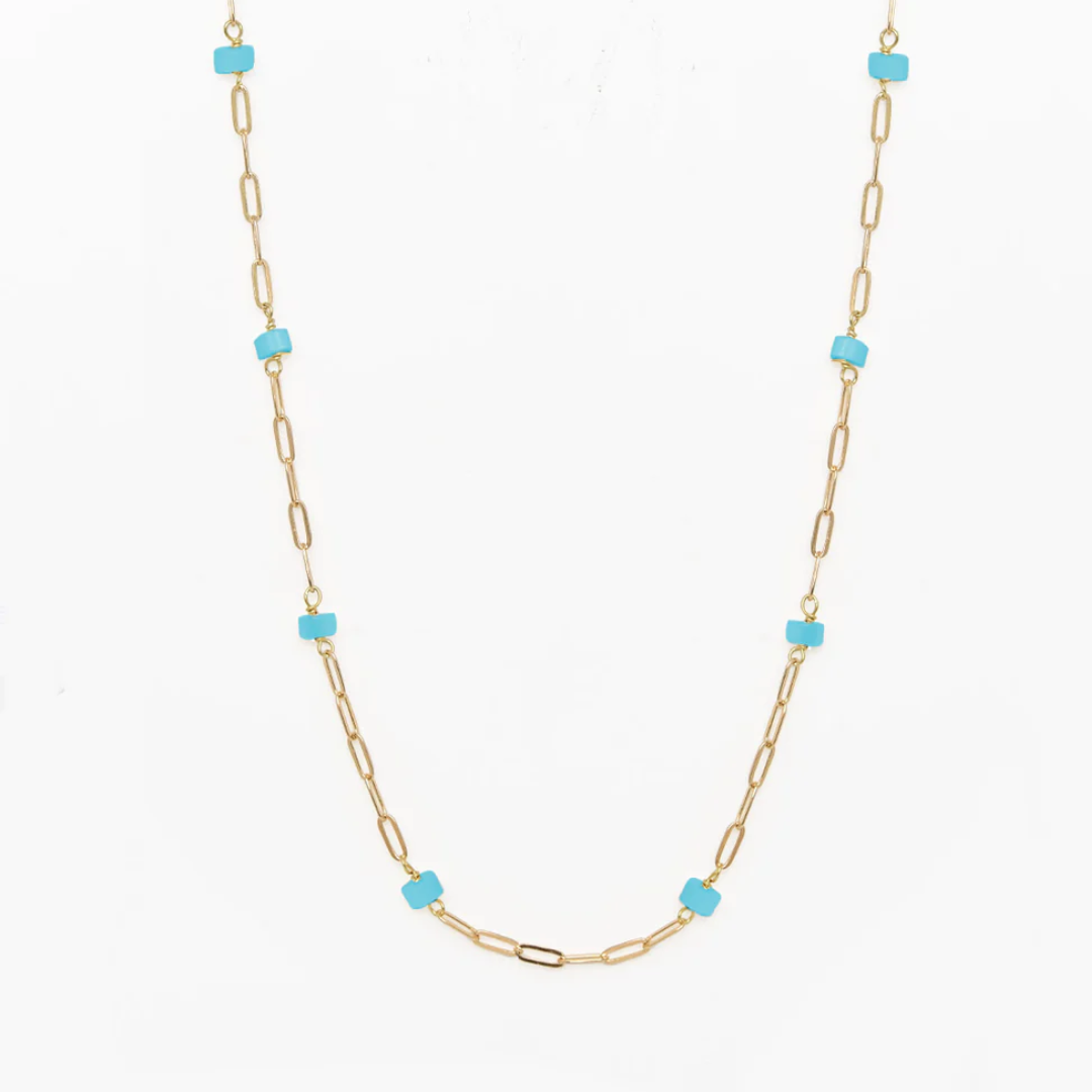 Beskrivelse Halskjede i forgylt sølv og fargde steiner. Material: Sterling Sølv, 925 Overflate: Forgylt Kjedelengde: 42 + 3cm Stein dimensjon: 0.2 x 0.5 cm Vekt: 3g Håndlaget lokalt i Porto i Portugal med 100 % resirkulert sølv. |