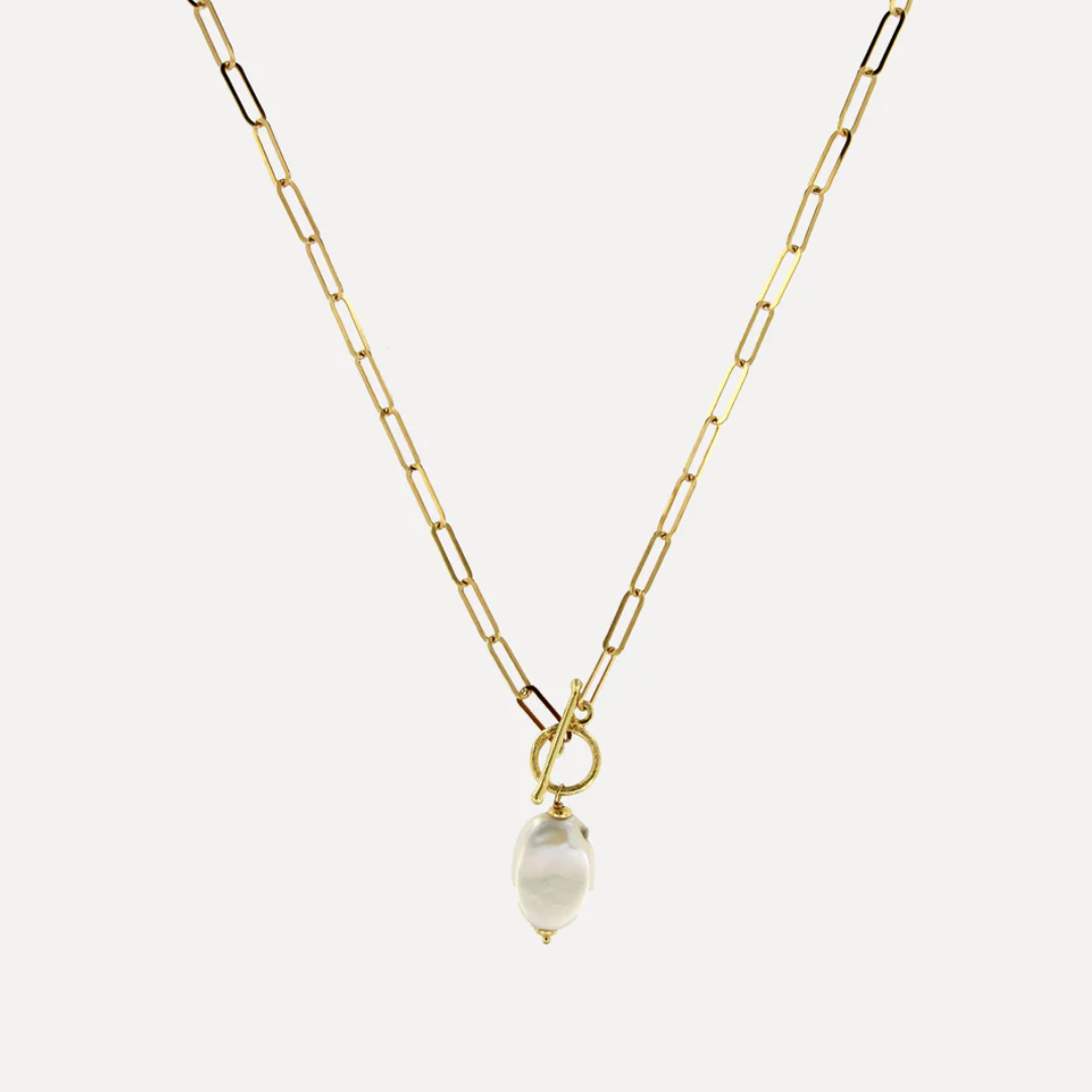Beskrivelse Halskjede med ferskvannsperle. Material: Sterling Sølv, 925 Overflate: Forgylt Kjedelengde: 45cm Anheng: 1.7 x 1 cm Vekt: 8 g Håndlaget lokalt i Porto i Portugal med 100 % resirkulert sølv. |