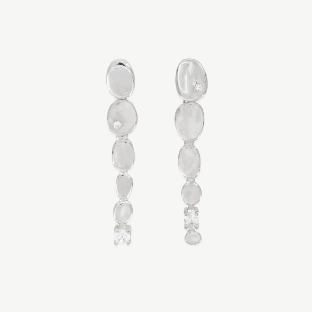 Beskrivelse Øreringer med sirkel heng og blanke steiner. Material: Sterling Sølv, 925 Overflate: Rhodinert Størrelse: 4 x 0.6 cm Steiner: Cubic zirkonia Vekt: 3,3g Håndlaget lokalt i Porto i Portugal med 100 % resirkulert sølv. |