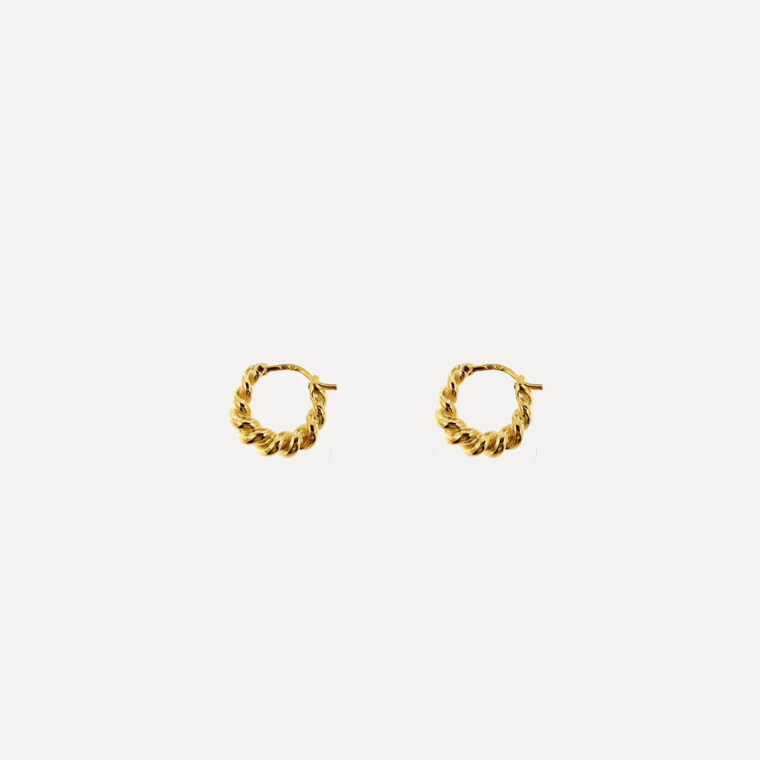 Beskrivelse Øreringer med krøll. Material: Sterling Sølv, 925 Overflate: Forgylt Diameter øreringer: 1,5cm Vekt: 3g Håndlaget lokalt i Porto i Portugal med 100 % resirkulert sølv. |