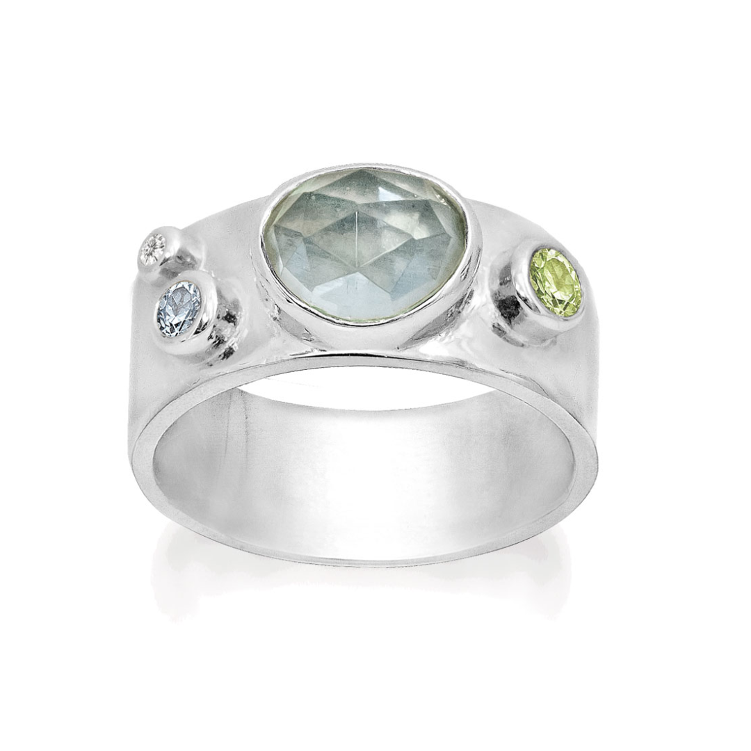 8x7mm aquablå kvarts, 3mm peridot, 2,5mm sky blue topas, 1,5mm zirkonia