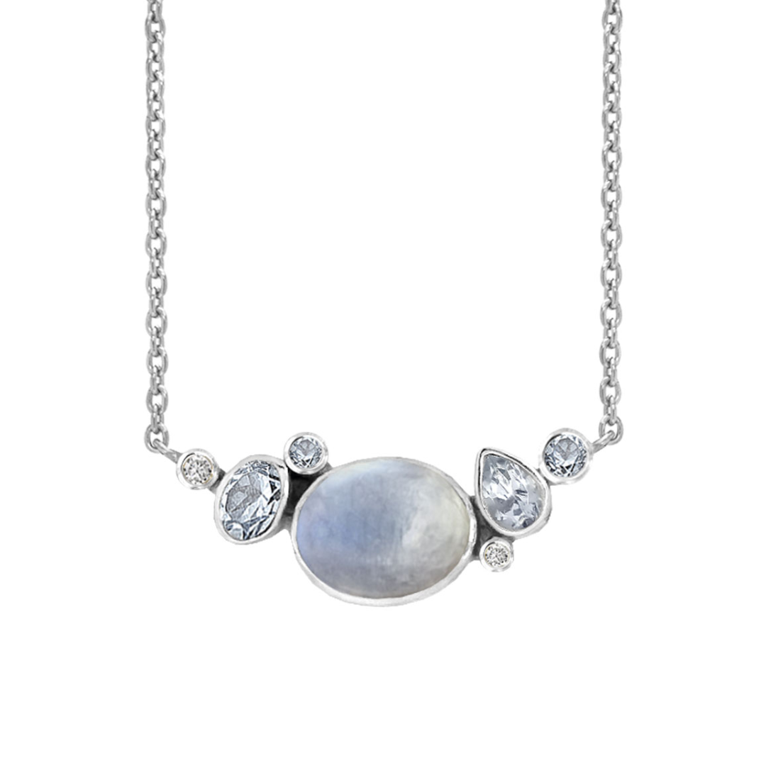 Beskrivelse Sterlingsølv 10x8mm rainbow månesten, 5x3mm sky blue topas, 5x3mm sky blue topas, 2mm zirkonia, 1,5mm zirkonia, 1,5mm sky blue topas, 2,5mm sky blue topas Lengde: 42/45 cm Bilde lånt fra leverandør nettside: www.rabinovich.dk |