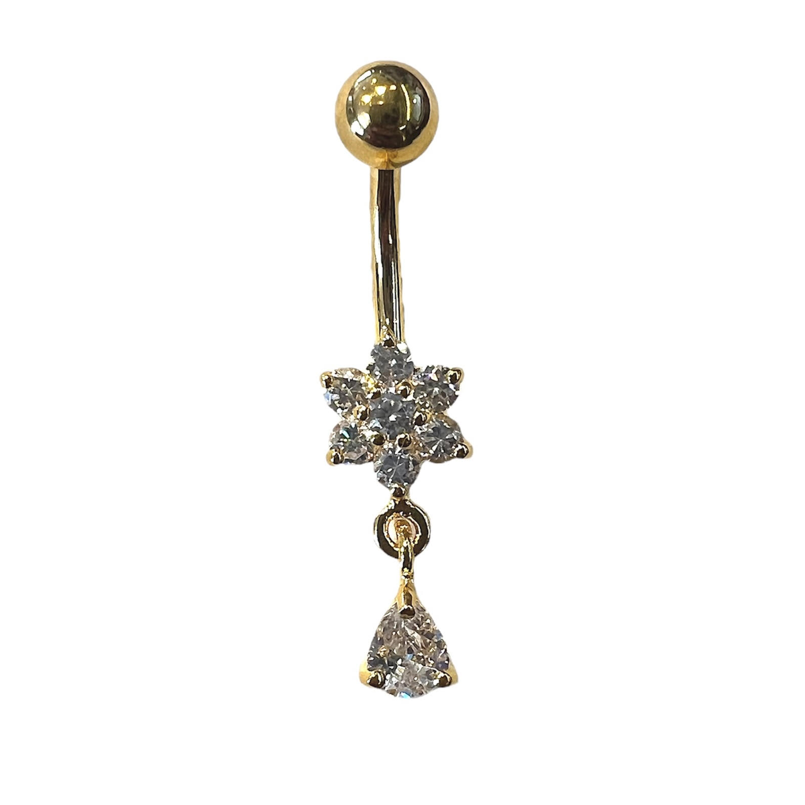 Navlepiercing forgylt m. blank blomst & dråpe heng